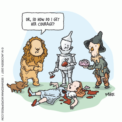 – a Oz esiste ancora la pena di morte e a somministrarla è l’Uomo di Latta con la sua scure. Visto? Dici tanto buon cuore buon cuore e invece è il boia. L’Uomo di Latta tra l’altro ha anche il ruolo di difensore di Eureka che però poi dovrebbe uccidere se si rivelasse colpevole. WTF.